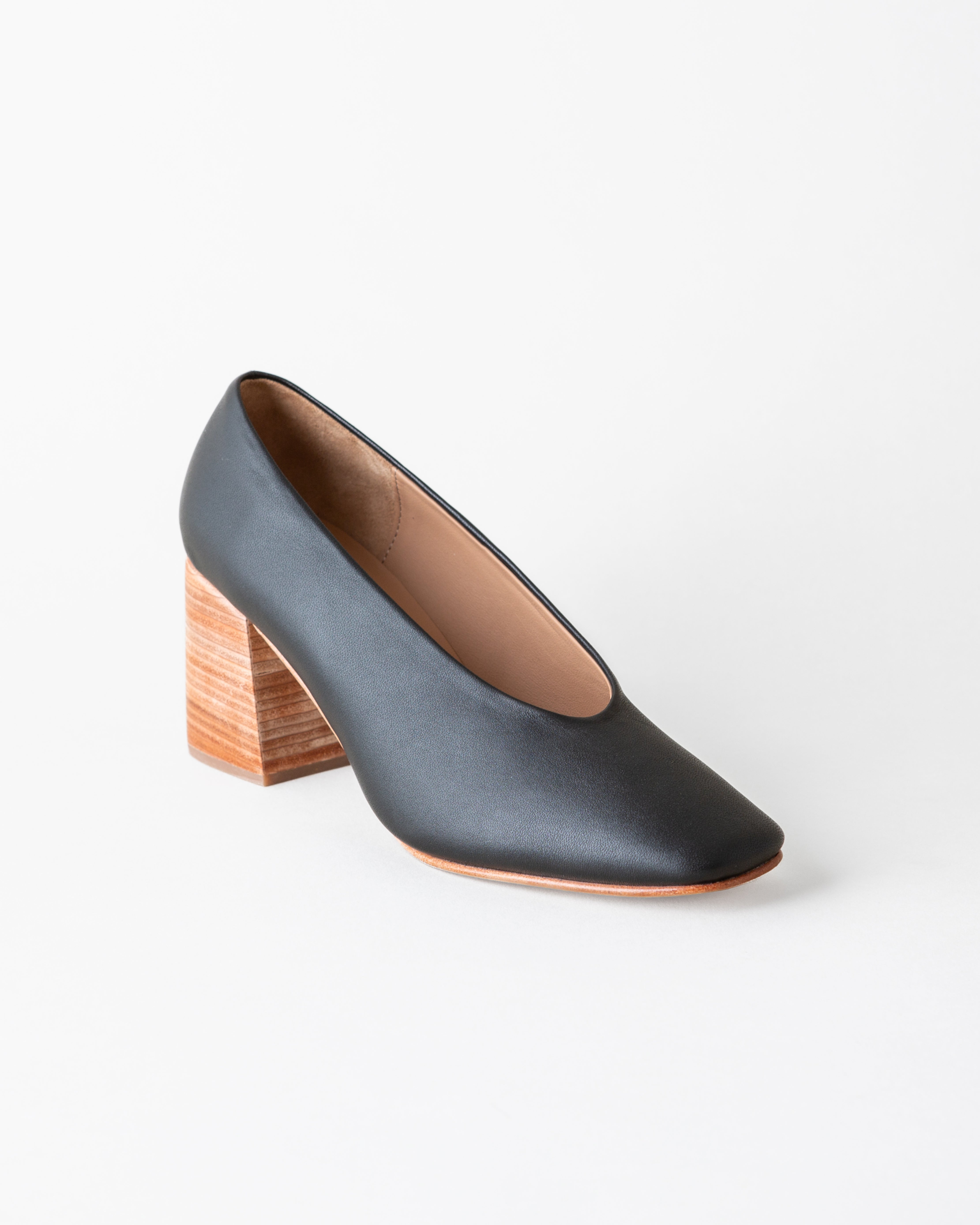 A classic square-toe pump with a stacked wood heel.