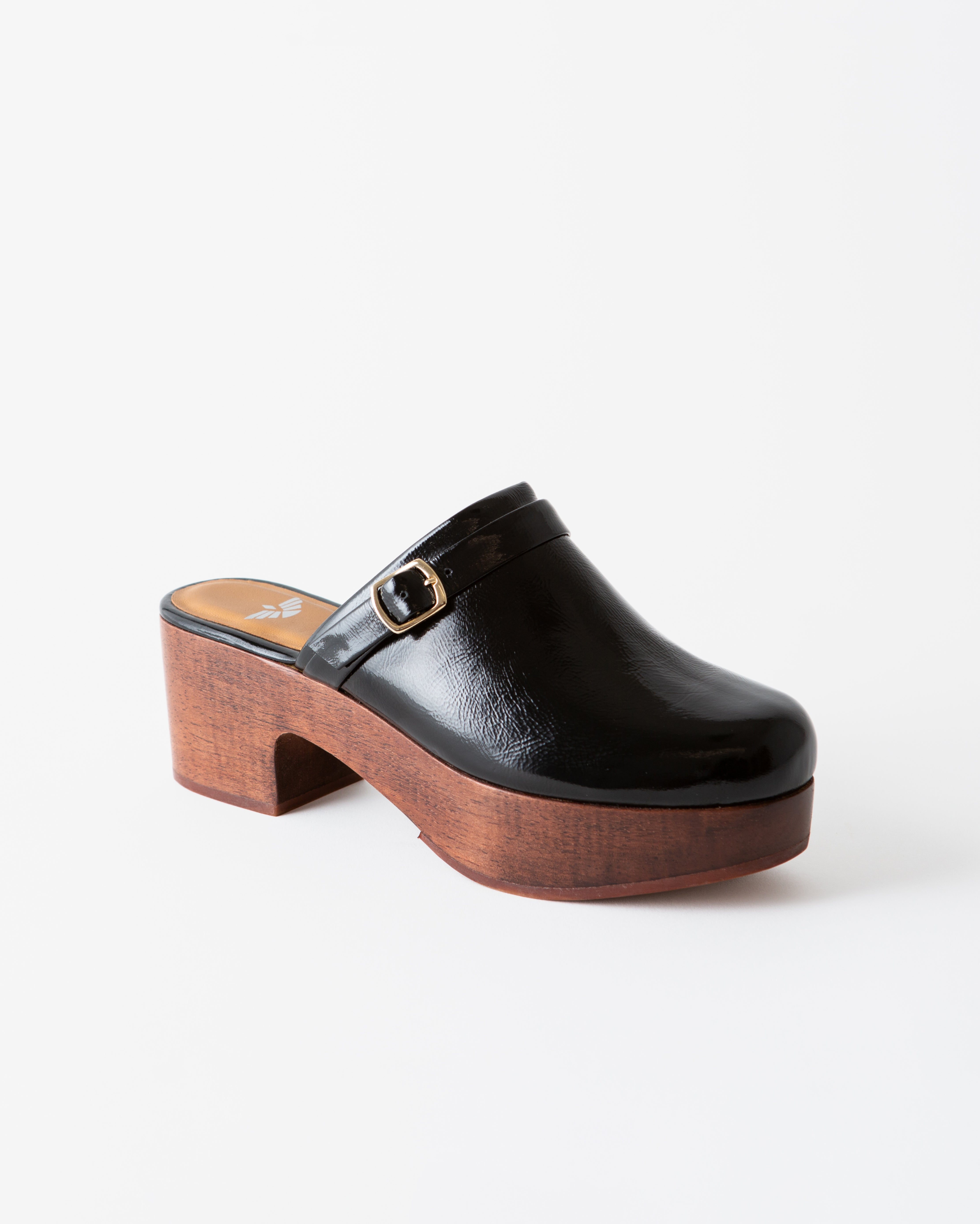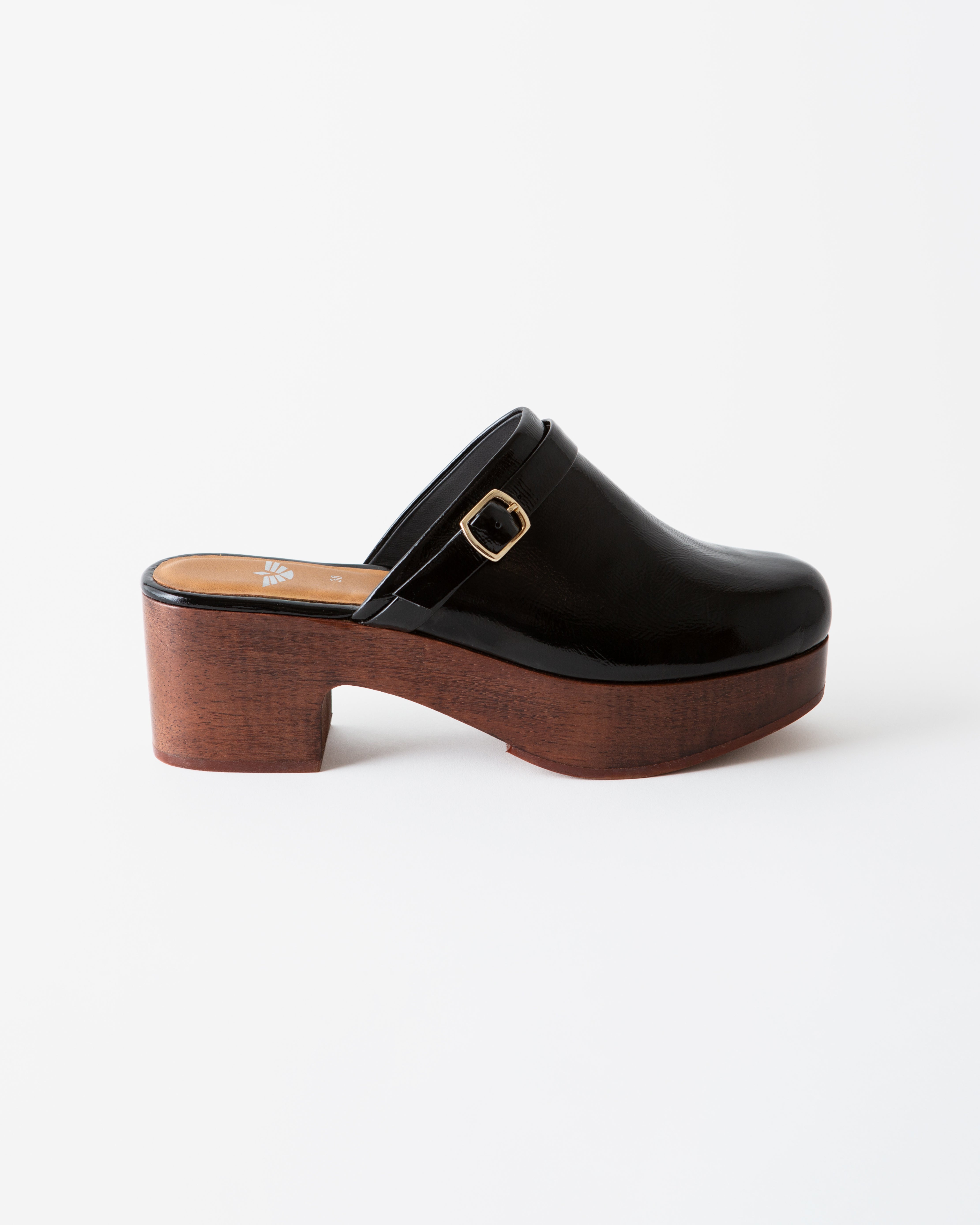 An elevated patent leather clog with a buckle detail.