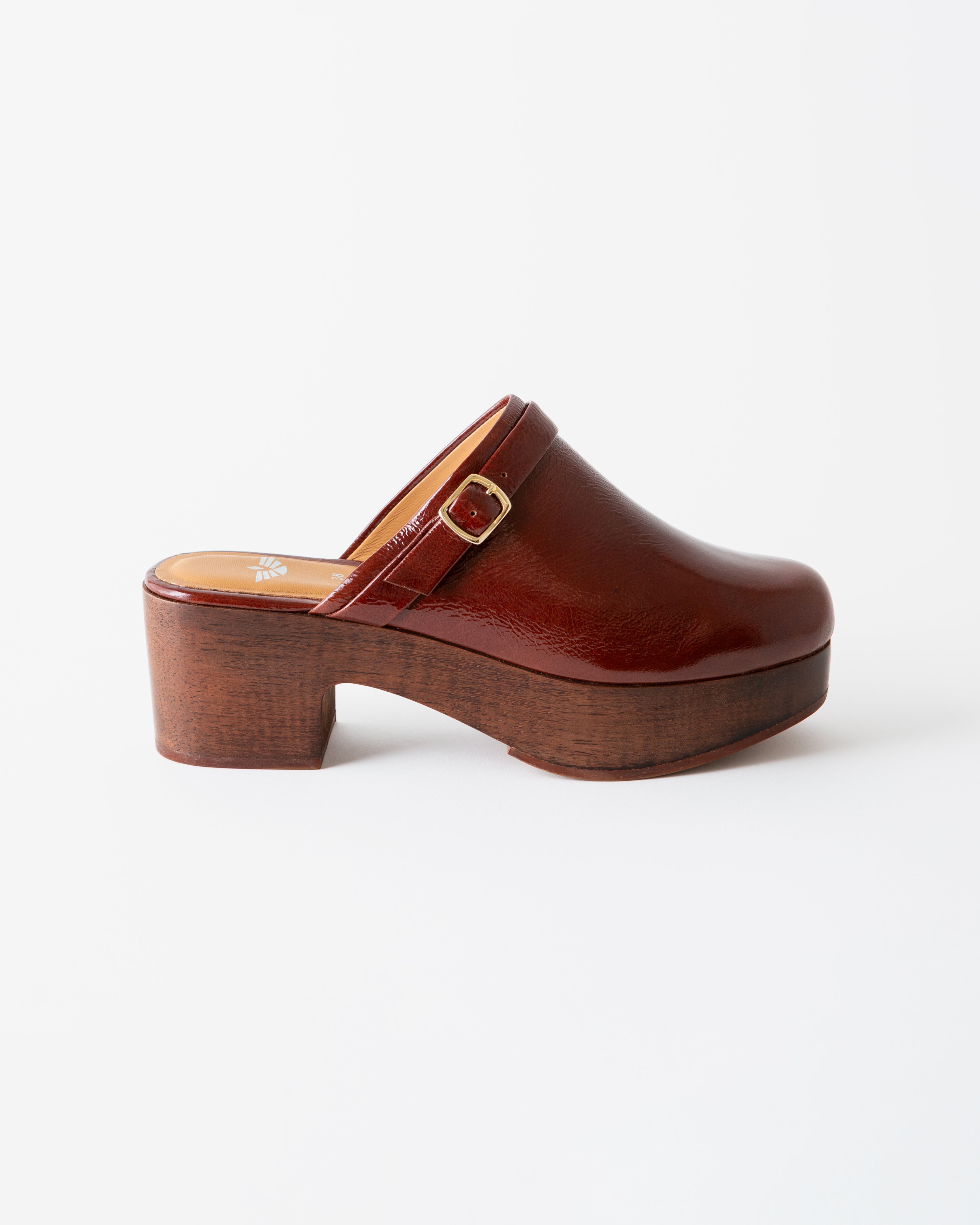 An elevated patent leather clog with a buckle detail.