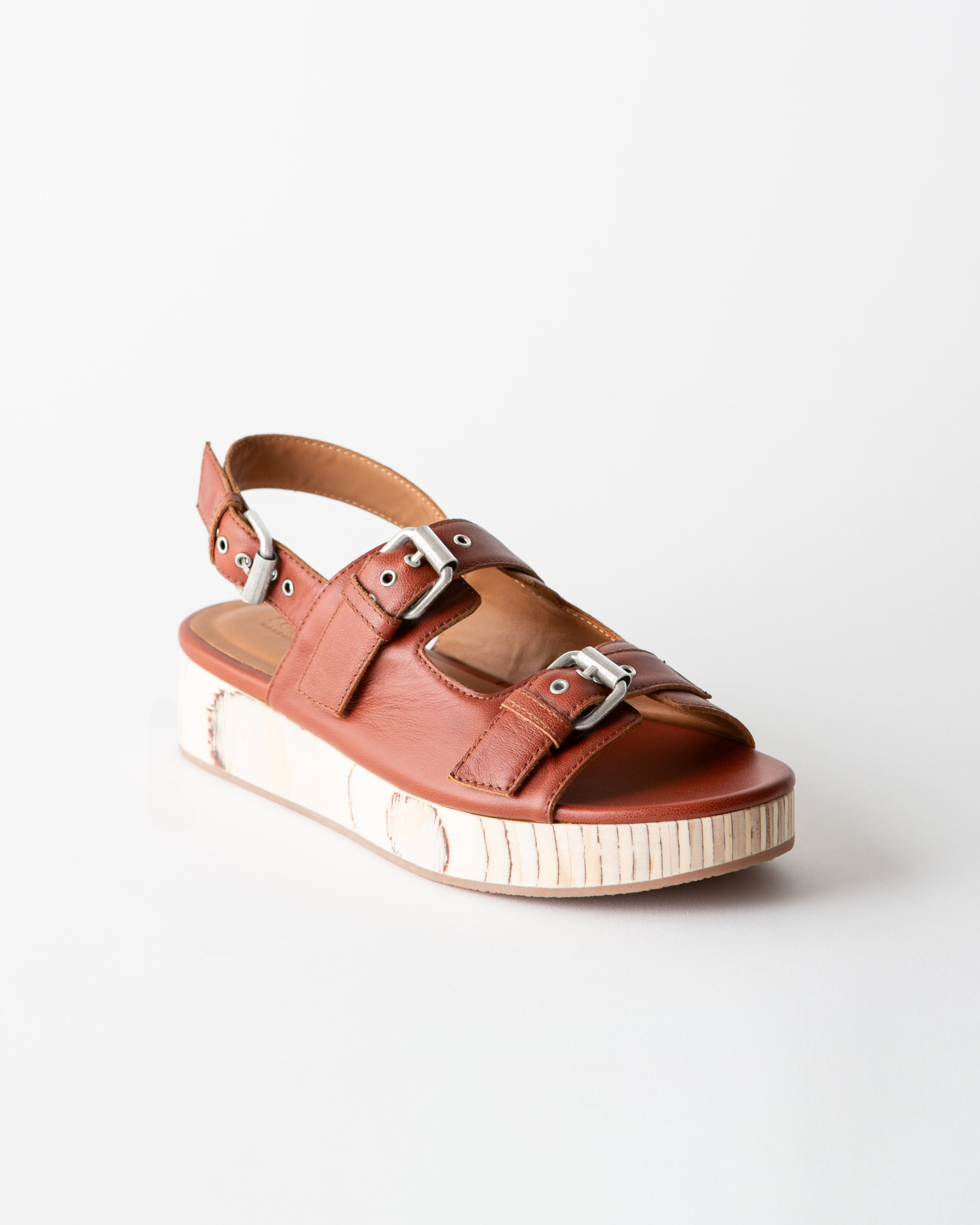 A statement sandal with a wood platform, adjustable buckles, and a soft leather upper.