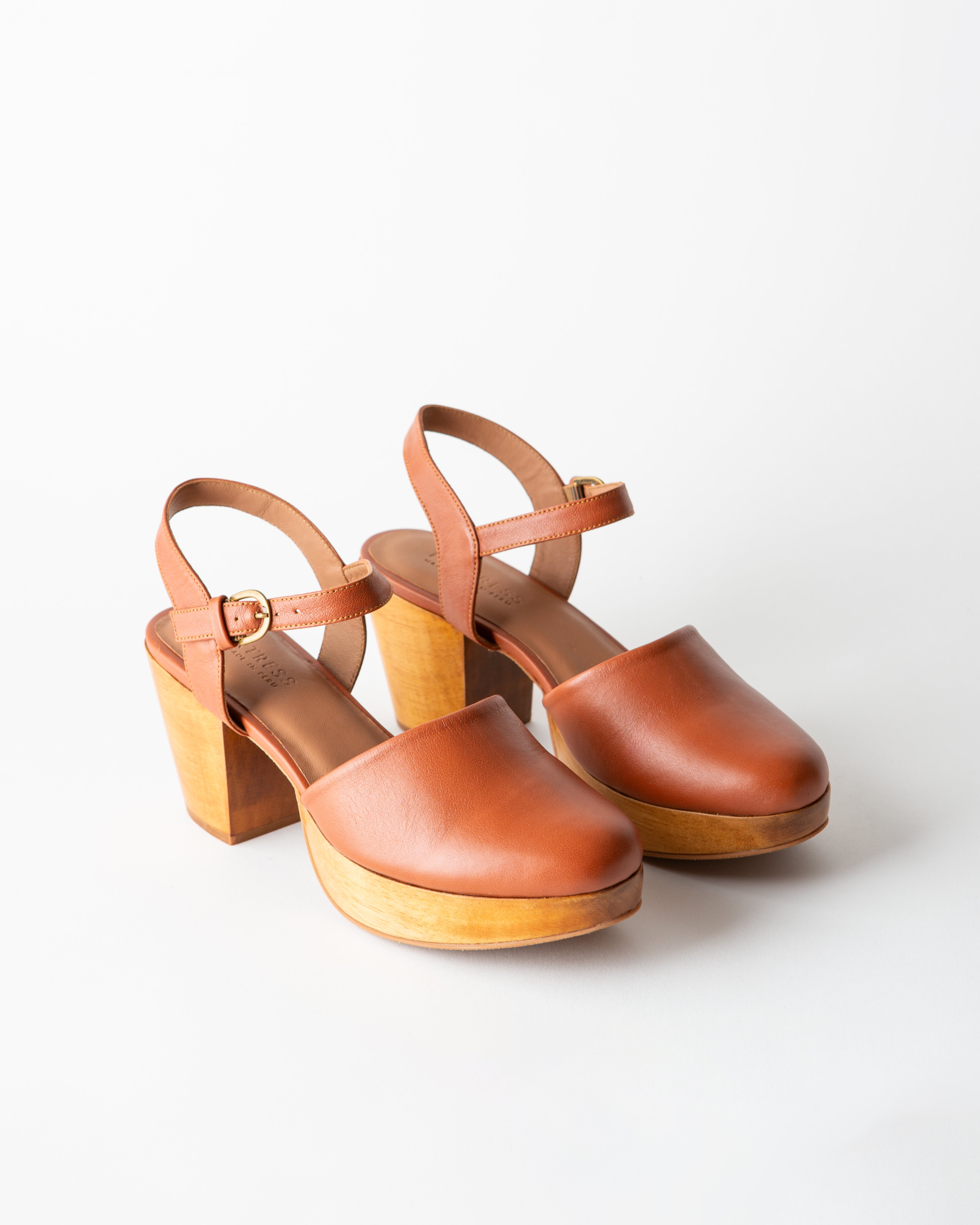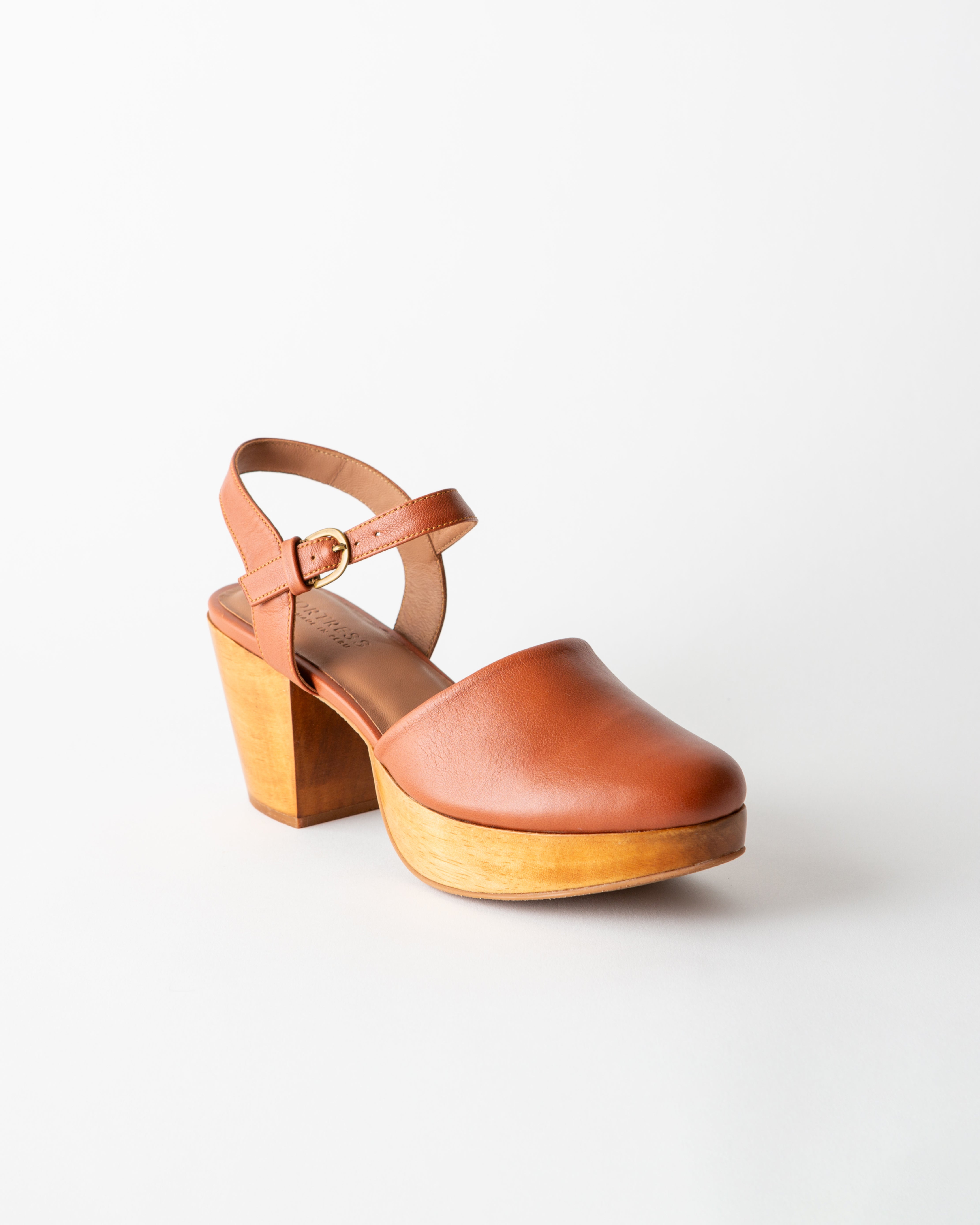 A Mary-Jane-inspired wood clog with an ankle strap.